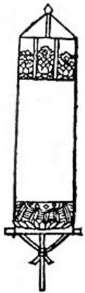 ‘만장의 바탕은 일반적으로 두꺼운 흰 종이나 비단이다. 위에는 연꽃잎(복련엽覆蓮葉)을 그리고 아래에는 물결치는 연꽃(수파련水波蓮)을 그렸다. 만장의 길이는 7척, 너비는 1척 9촌이다. 위아래에 강목杠木을 대어서 구겨지지 않도록 하고, 자루는 대나무(오죽烏竹)를 쓴다. 강목의 끝과 자루 머리에는 모두 축軸을 설치하고 흰 칠을 한다. 장대 머리에는 가죽끈(영자纓子을 드리운다. 아래 축에는 끈을 맨다. 이러한 만장이 국장 때는 96축軸(장)이다.’