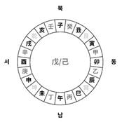 그 배치 방법은 동방을 나타내는 묘卯방의 전후로 갑·을을, 남방을 나타내는 오午방의 전후로 병·정을, 중앙에 무·기를, 서방을 나타내는 유酉방의 전후로 경·신을, 북방을 나타내는 자子방의 전후로 임·계를 배치한다. 그리고 축·인, 진·사, 미·신, 술·해 사이에는 8괘 방위 중 정방위 사이에 있는 건·곤·손·간 4괘를 배치한다. 이를 그림으로 나타내면 아래와 같다.