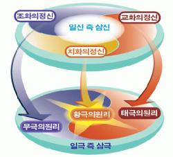 동북아 한민족은 ‘근원의 존재’로 ‘삼신三神’을 말한다. 삼신은 ‘삼신일체三神一體’이다. 이는 근원의 본체[一體]와 삼신三神이 따로 떨어져 독립적으로 존재한다는 의미가 아니라, 주체主體로는 ‘일신’이나‘ 작용으로만 삼신’임을 뜻한다.